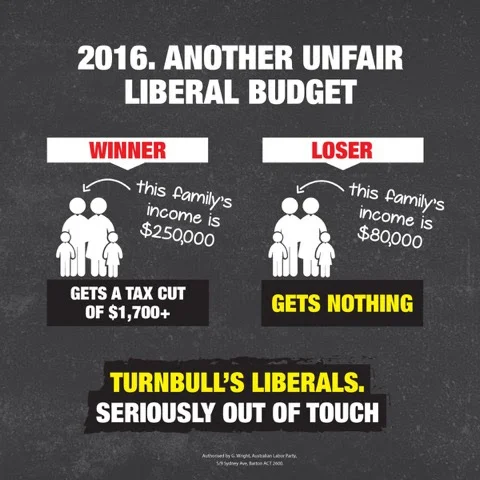 3. At the same time Malcolm Turnbull is giving big businesses a tax cut, he’s also giving people on high incomes a tax cut. Mr Turnbull's been spruiking an income tax cut, but who really benefits? For a working mum earning $87,000 a year with two kids in high school, even with Malcolm Turnbull’s $6 a week tax cut, she’ll lose $4,500 a year in this Budget. At the same time, by giving a two per cent tax cut to people earning more than $180,000, someone earning $1 million a year will be given a $17,000 tax cut. This is where Malcolm Turnbull’s priorities lie.