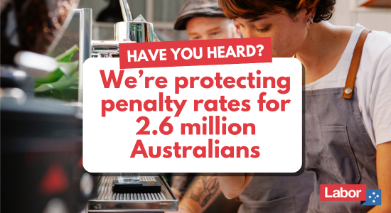 1. On Thursday our legislation to protect penalty rates for the 2.6 million Australians passed the Parliament. As the PM said in Question Time, “Penalty rates are the things that can make a difference for people... If you're working on a Saturday night, or on a Sunday, if you're working on a public holiday, you should be compensated for what you are giving up and that is what this legislation will ensure.”